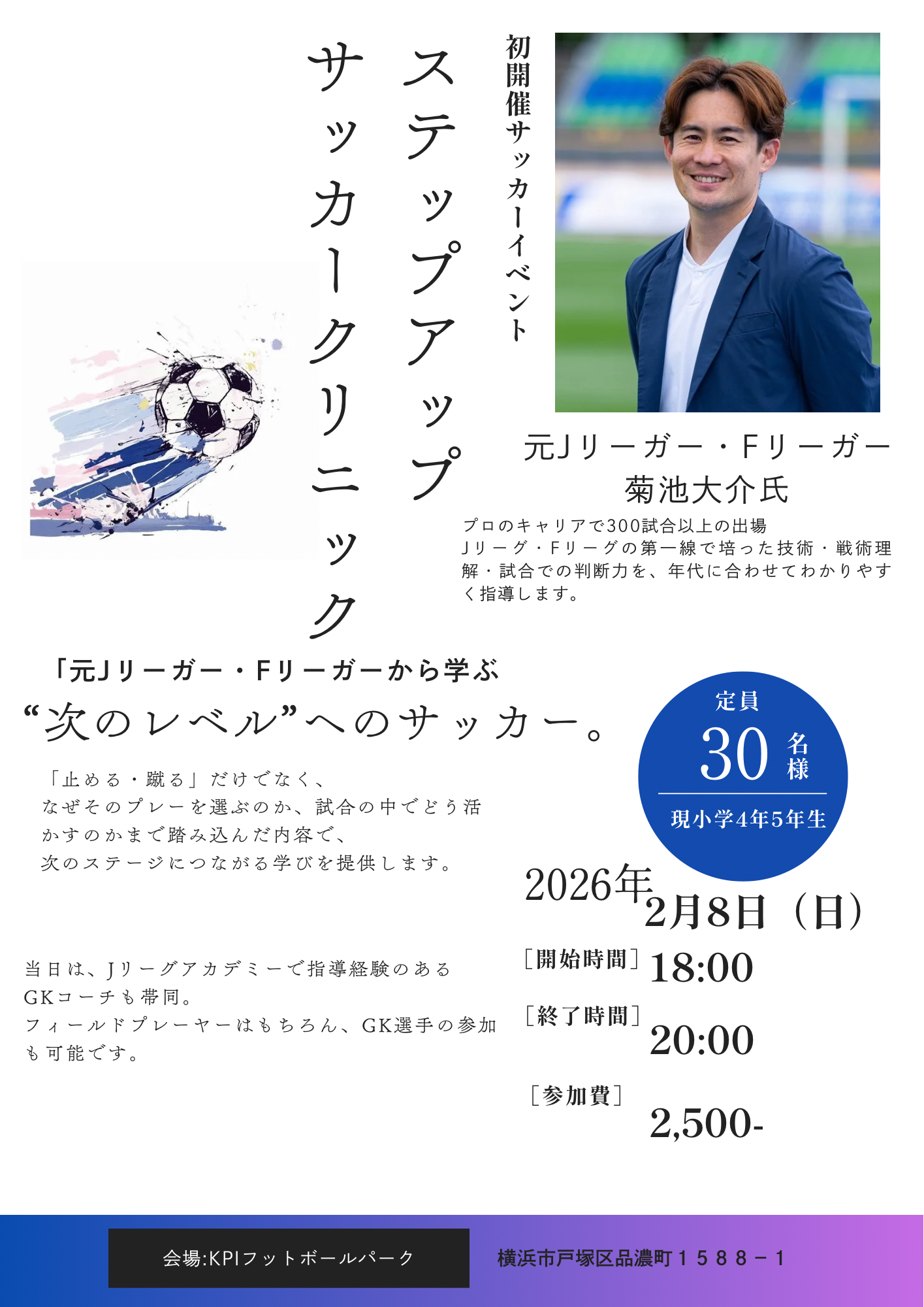 元Jリーガー・Fリーガー 菊池大介氏による、小学4・5年生を対象としたサッカークリニックを開催します。